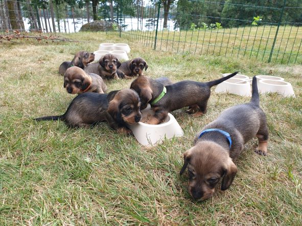 Tiden går fort och nu är valparna 4 veckor. Vi har slängt ut valplådan och satt upp kompostgallet i köket för att dom ska få mer plats att leka i. Idril är inte lika angelägen om att var med dom vilket är bra för att vi håller på att öka tiden mellan att valparna diar samtidigt som dom numera får uppblött hundfoder 4 ggr om dagen. Det tär väldigt på Idril som har blivit trådsmal trots att vi ger henne så mycket mat som hennes mage klarar.