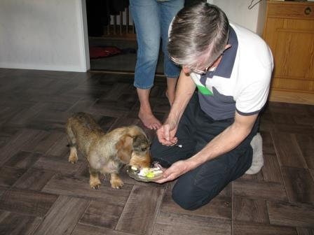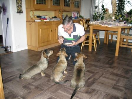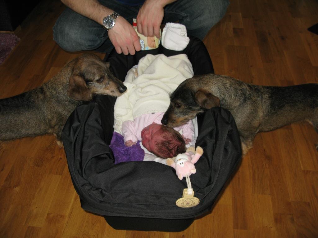 Nu var det ett tag sedan vi la ut något här och det ber vi om ursäkt för men det har varit mycket annat. Vi ska bättra oss framöver.Den 31/5 blev det tillökning på kenneln, det blev "bara" en men det var av den tvåbenta varianten. Det kom en liten Wilma på 3680g och 52cm. När Wilma kom hem första gången var Lovis lika glad som vanligt att det kom någon som inte kunde försvara sig mot hennes tunga. Zinta var som vanligt lite avvaktande för hon vet att sådana små människor brukar skika ofta och högt. Men så fort Maria tog upp Wilma och började amma henne så fattade dom att det var vår "valp" och då blev dom båda väldigt glada och behandlade Wilma som en av sina. T. ex. så la Maria Wilma i sängen och då började Zinta direkt att bädda för henne. I bilden nedan ser vi när vovvarna träffar Wilma för första gången.