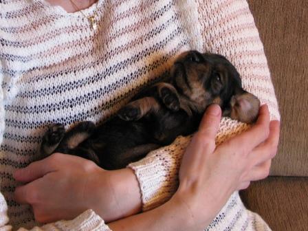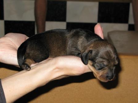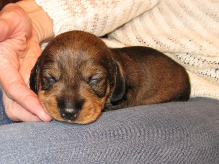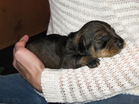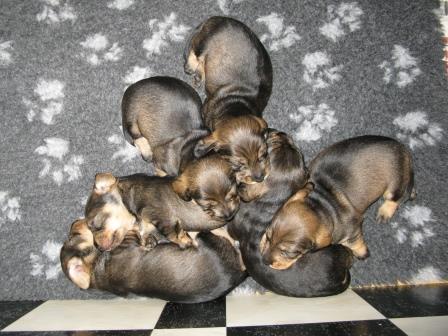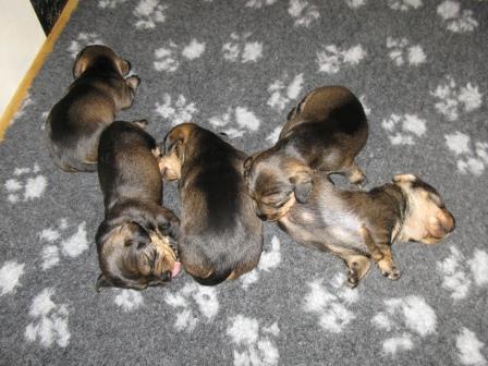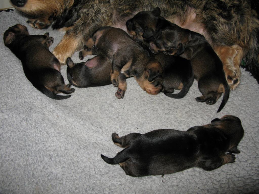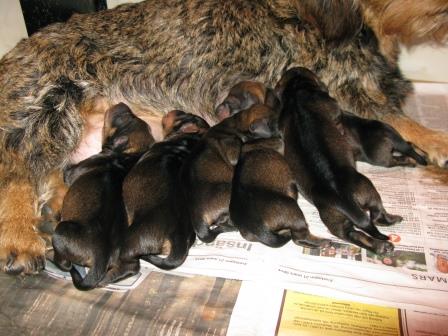 Nu är valparna två veckor gamla och dom växer fort. Dom har alla öppnat sina ögon, även om dom bara är små springor än. Dom har även börjat krypa runt lite mer. Elvira är en god mor och sköter om dom och vaktar dom.