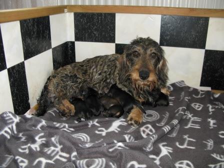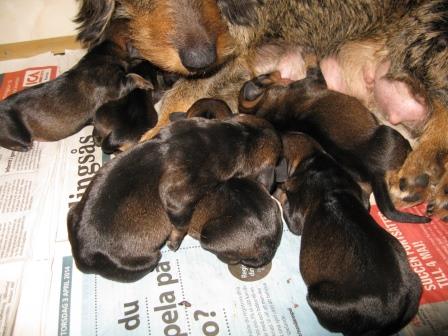 Idag, några dagar för tidigt, födde Elvira en kull med sex pigga valpar. Samtliga är hannar! Den förste kom i mattes säng kl 11 och sedan kom dom i följd med den siste redan kl 14. Alla mår bra och Elvira verkar ta mammarollen på allvar. Jag kommer att lägga upp lite bilder under helgen så ni får se de små miraklen.