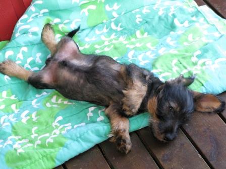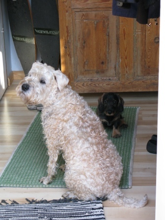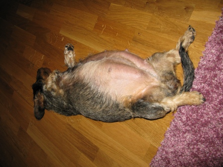 Nu är det inte långt kvar. Lovis bara fortsätter att växa. Hon har nu gått upp 2,5kg till 11,3kg. Det är en ökning med nästan 30%, ungefär som om jag skulle gå omkring med en 25kg tung cementsäck hängandes på magen. Hon ligger mest i sängen hela tiden nu, hon går upp ibland för att göra sina behov och äter fortfarande motvilligt och i små portioner. Vi får lyfta henne båda upp och ner nästan överallt. Det ska bli riktigt spännande att se hur många valpar det blir.