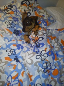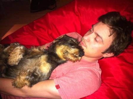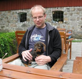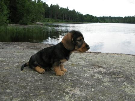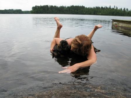 Nu har vi bara Edvin kvar här hemma. Nikolaus flyttade hem till Falun med sin nya husse och matte i lördags. Innan han for hann han bada i sjön igen. Edvin fick sova i våran säng för första gången i natt. Det gick bra förutom att han vaknade kl 5 och ville ut. Han gjorde snabbt ifrån sig och förhoppningen var att han skulle somna om men icke. Han var för pigg och sprang mellan mig och Maria och försökte bita oss i håret, örat, näsan mm. Ikväll får vi försöka trötta ut honom lite mer innan vi lägger oss.