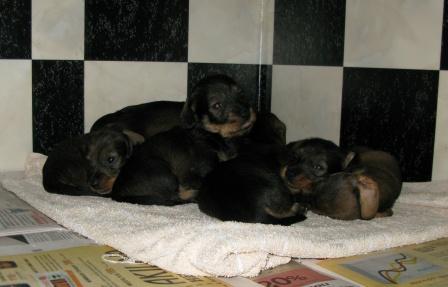 Nu har alla valparna öppnat ögonen och dom börjar röra sig allt mer. De har börjat ta små steg även om det fortfarande är mycket vingligt. Kolla in båda videorna (länken är till en annan video) så får du se själv.