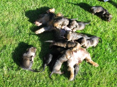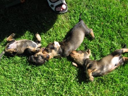Valparna mår bra och älskar att vara ute i gräset när vädret tillåter. De är jätteduktiga och har börjat säga till när de vill gå ut och göra sina behov. Tänderna har börjat komma upp så nu gör det rejält ont ibland när de bits.