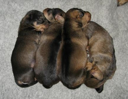 Valparna växer fortfarande otroligt snabbt. Teodor t.ex. gick upp 50gram (10%) på en dag och är numera störst. Idag har den första valpen, Nikolaus, öppnat ögonen och dom har börjat komma upp på alla fyra ben. Det dröjer inte många dagar innan de vinglar omkring och utforskar världen.