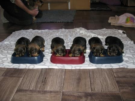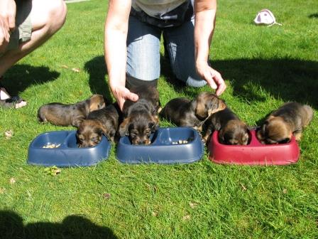 Nu är valparna drygt 4 veckor och det händer mycket i deras nya liv. Dom springer och bråkar med varandra. Dom har börjat äta fast föda (uppblött valpfoder) och har fått börja utforska utomhusvärlden. Det är en väldigt jämn kull, till utseende och storlek, och det är fortfarande en utmaning att skillja dom åt.