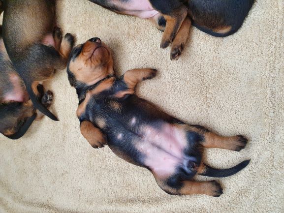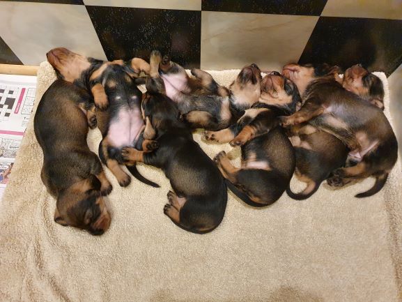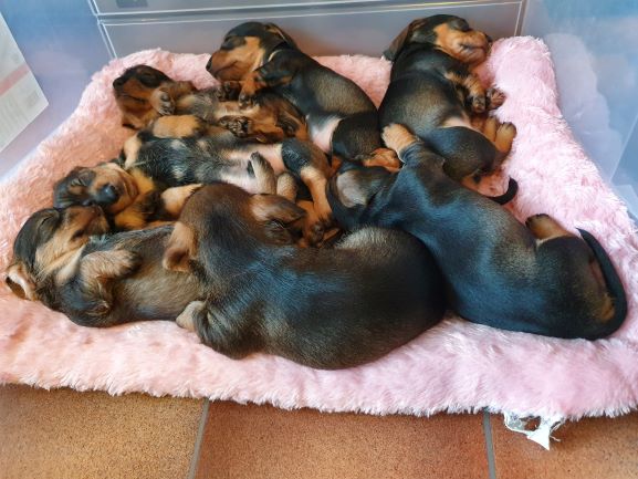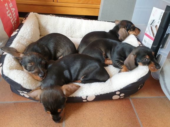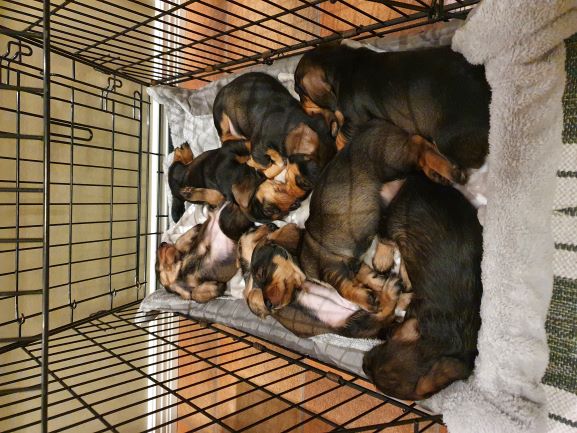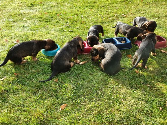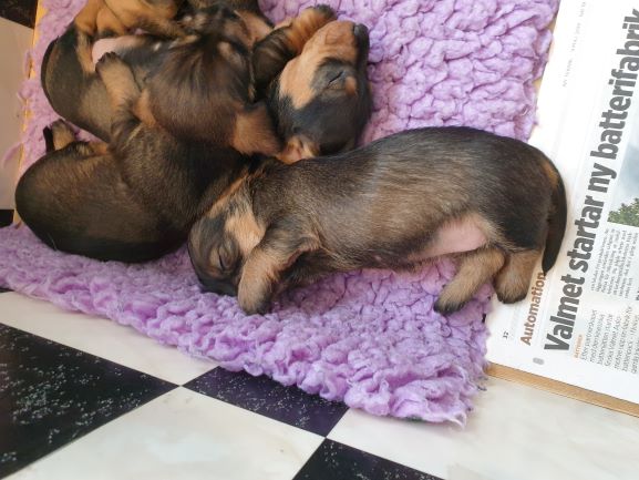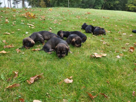 Veckorna går fort nu. Valparna fortsätter växa och nu är det full fart. Dom är allt mindre i valplådan, mest på natten. Större delen av tiden spenderar dom i köket. Dom sover fortfarande mycket men där emellan så är det fulll fart och lek. Dom kommer ut på gräsmattan flera gånger om dagen för att gör sina behov. Men det är bara korta stunder då det är lite kyligt för så små krabater.