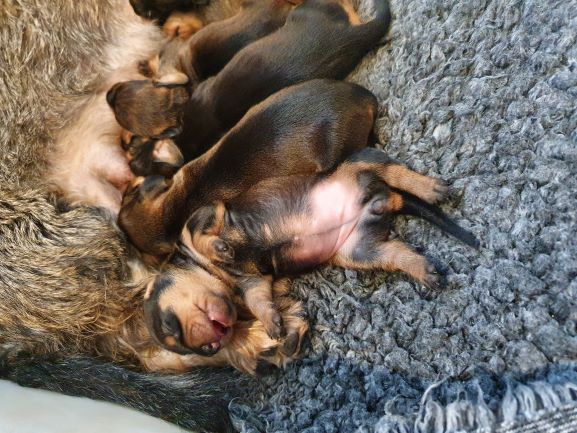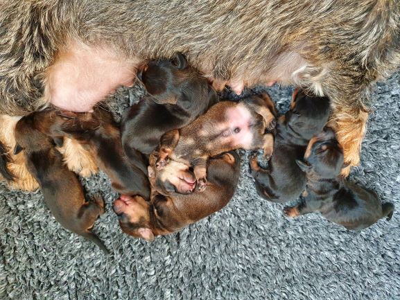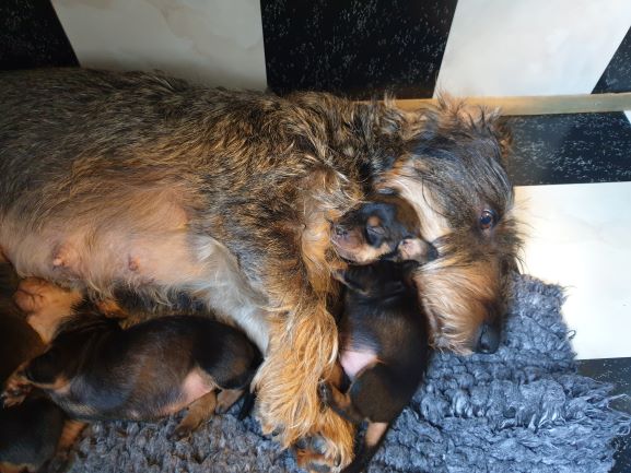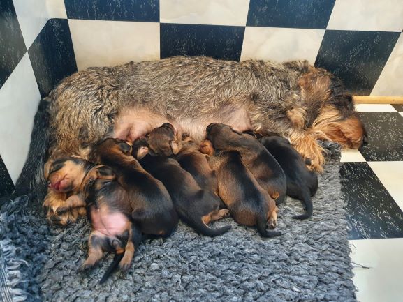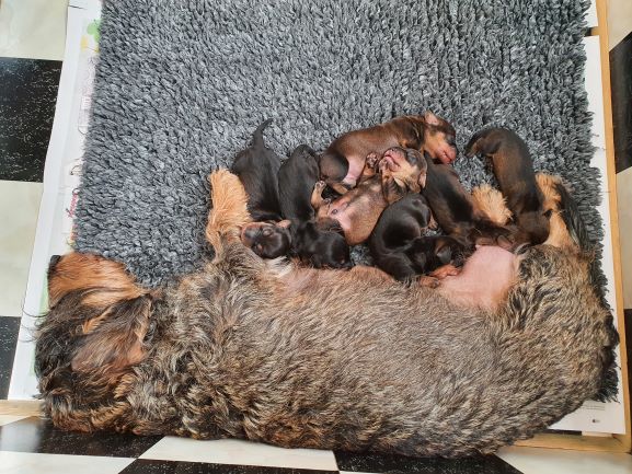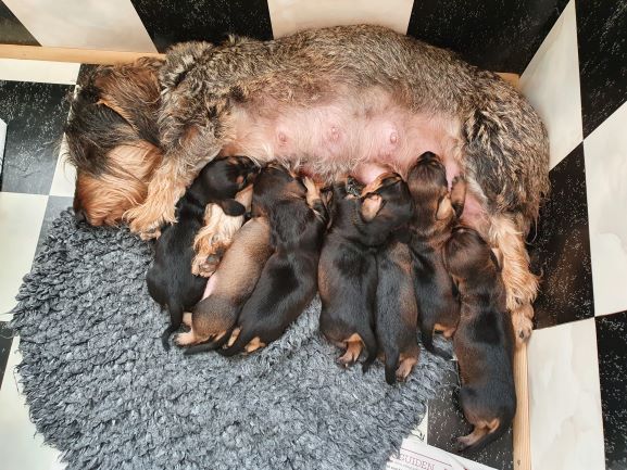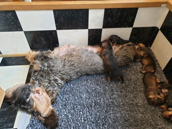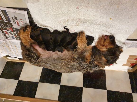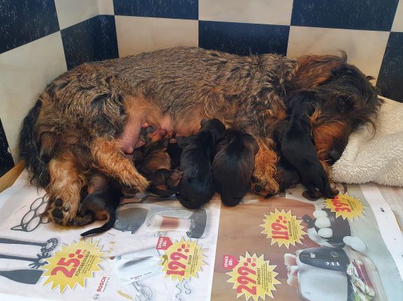 Nu har valparna fötts! Värkarna började runt 19:30 igår kväll och vattnet gick strax därefter. Första valpen föddes ca 20:30 och dom första fyra kom i hyffsad takt för att sedan ha ett långt uppehåll till nummer fem som följdes av dom sista två. Den sista föddes kring kl01 och husse och matte kom i säng runt kl 3. Det blev en fin kull med 5 tikar och 2 hannar. Idril och valparna mår bra och hon tar väl hand om de små.