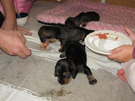 Valparna har fått komma ur valplådan och har utforskat vårt kök vilket är mycket ansträngande. Dom fick även prova lite fast föda för första gången, en blandning av köttfärs, äggula och olja. Det var både gott och konstigt. Och mycket jobbigt som syns på sista bilden.