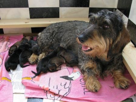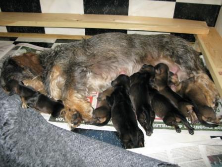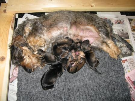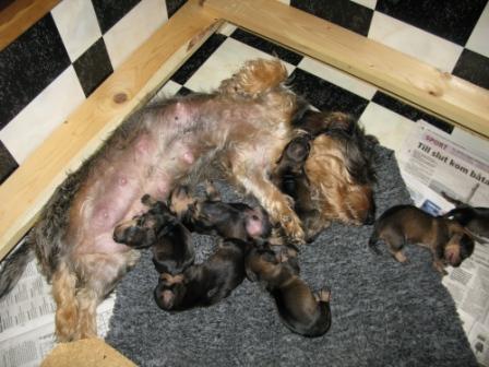 Hon hade väldigt lätt att föda dom och nu ligger hon lungt tillsammans med dom i valplådan i vårt kök och vilar. Även husse och matte skulle nog behöva en tupplur.