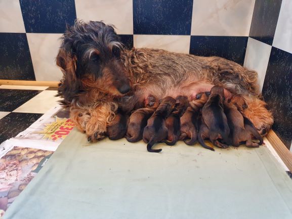 Första dygnet efter valpningen var lite stressig. Idril hade lite svårt att komma till ro. Vi fick ännu en natt med lite sömn men sedan har det gått hur fint som helst. Valparna är lugna och växer så det knakar. Dom har i princip fördubblat sin vikt! Idril är lugn och spenderar mycket tid med valparna även om hon kommer ut ibland för att bli kliad av husse och matte. Så vi ser detta som lugnet före stormen. Det kommer att bli riktigt hektiskt med 10 valpar! Det blir en livlig sommar för oss.