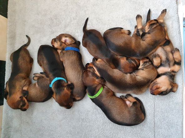 I tisdag 29/6 så födde Idril en stor kull på 10 valpar. Det var enväldigt jämn kull både storleksmässigt och könsmässigt, 5 hanar och 5 tikar. Värkarna började mitt i natten, strax för kl 03, och första valpen kom strax efter kl 04. Sedan kom det valpar i jämn takt fram till nummer 9 som föddes 9:35. Då trodde vi det var över och att hon bar hade lite eftervärkar för att få ut kvarblivna moderkaka. Mycket riktigt så kom det en efter någon timme. Helt plöstligt vid 12:45 kom nr 10. Idril och alla valpar mår bra. Efter några oroliga nätter har Idril lugnat ner sig så vi får sova någon timme i taget. Vår dotter älskar att var med valparna och hjälpa dom tillbaka till Idril när dom gått vilse. Vi håller på att kontakta personer som anmält intresse men om ni är intresserade så kan det finnas någon valp som inte är tingad.